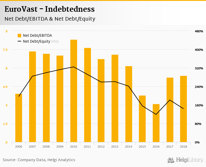 EuroVast's net debt stood at EUR 22.6 mil and accounted for 144% of equity at the end of 2018. The ratio is down 37.8 pp compared to the previous year.
