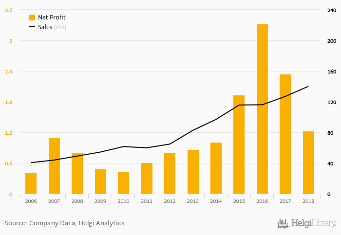 Sales have grown by 11.1% a year on average since 2008. They reached a high of EUR 140 mil in 2018 and a low of EUR 40.5 mil in 2006.