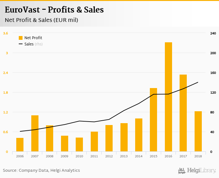 EuroVast made a net profit of EUR 1.23 mil in 2018, down 47.5% compared to the previous year. Total sales reached EUR 140 mil, which is up 10.5% when compared to the previous year.