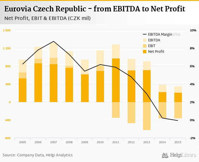 Eurovia Czech Republic made a net profit of CZK 210 mil with revenues of CZK 12,788 mil in 2015, down by 5.36% and up by 10.4%, respectively, compared to the previous year. This translates into a net margin of 1.64%.