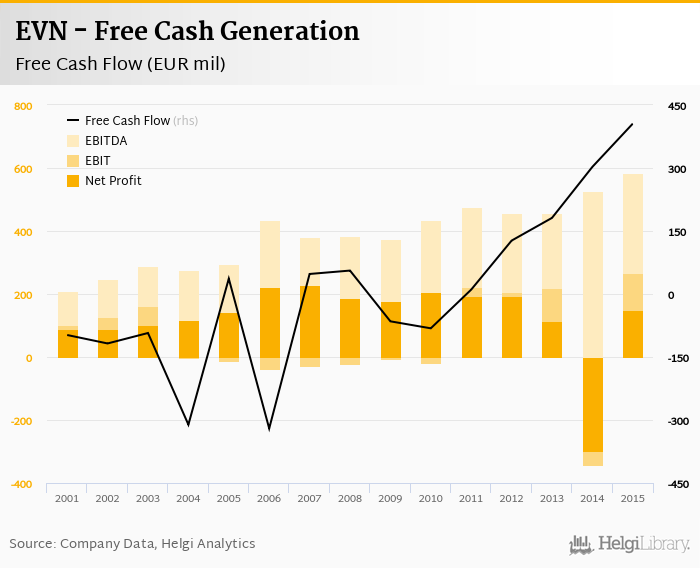 EVN made a net profit of EUR 148 mil with revenues of EUR 2,244 mil in 2015, up by 150% and up by 9.69%, respectively, compared to the previous year. This translates into a net margin of 6.60%.
