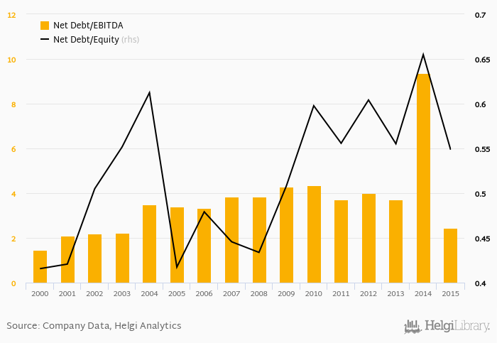 Net debt to EBITDA was calculated at 2.44x at the end of the year. That is up from 4.35x seen in 2010. The ratio reached a high of 9.36x in 2014 and a low of 1.46x in 2000.