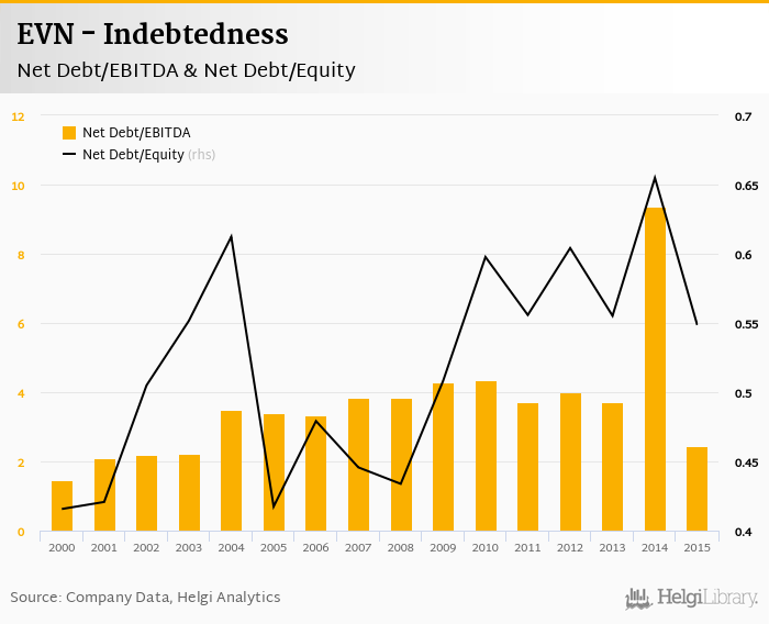 EVN's net debt stood at EUR 1,421 mil and accounted for 0.549 of equity at the end of 2015. The ratio is down 0.106 pp compared to the previous year.