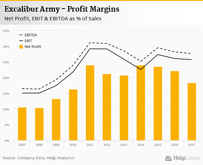 Excalibur Army made a net profit of CZK 384 mil with revenues of CZK 2,091 mil in 2017, down by 19.1% and down by 2.57%, respectively, compared to the previous year.
