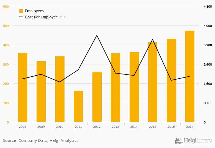 Staff cost represented of sales in 2017, 0 pp higher than a decade ago.