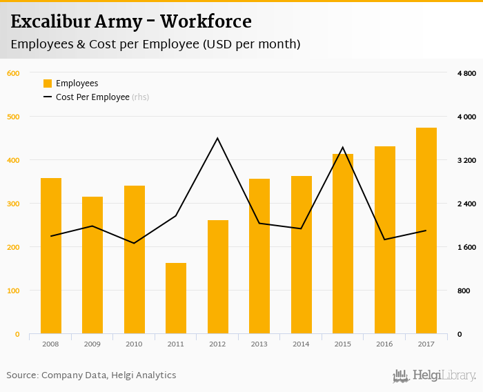 Excalibur Army employed 475 employees in 2017, up 9.95% compared to the previous year. Historically, between 2008 and 2017, the firm's workforce hit a high of 475 employees in 2017 and a low of 164 employees in 2011.