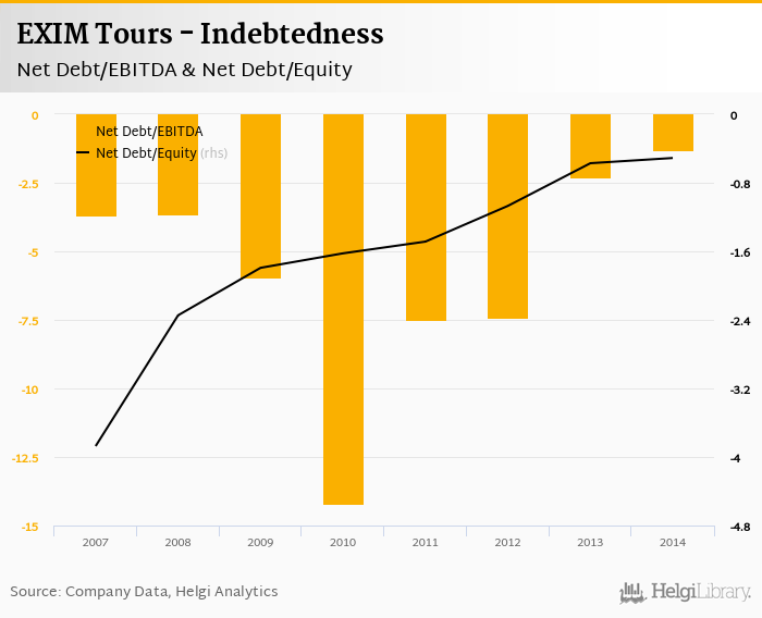 EXIM Tours's net debt stood at CZK -229 mil and accounted for -0.511 of equity at the end of 2014. The ratio is up 0.061 pp compared to the previous year.