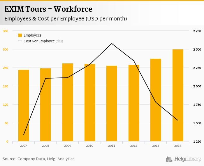 EXIM Tours employed 300 employees in 2014, up 11.1% compared to the previous year. Historically, between 2007 and 2014, the firm's workforce hit a high of 300 employees in 2014 and a low of 233 employees in 2007.