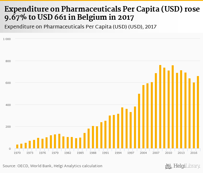 Expenditure on pharmaceuticals per capita rose 9.67% to USD 661 in Belgium in 2017, according to OECD.