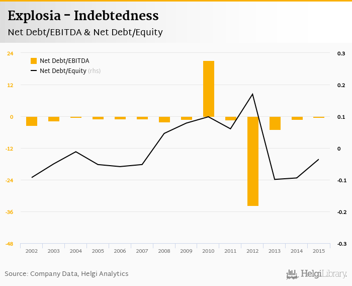 Explosia's net debt stood at CZK -38.1 mil and accounted for -0.035 of equity at the end of 2015. The ratio is up 0.059 pp compared to the previous year.