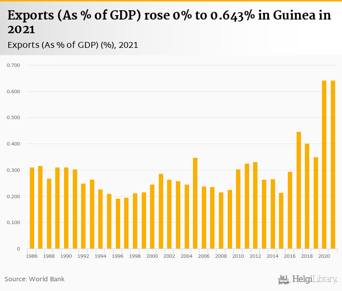 Historically, exports as a share of GDP in Guinea reached an all time high of 0.562% in 2021 and an all time low of 0.132% in 1996.