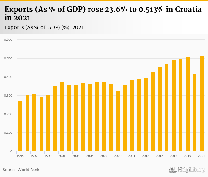 Historically, exports as a share of GDP in Croatia reached an all time high of 0.595% in 2022 and an all time low of 0.273% in 1995. When compared to Croatia's main peers, exports as a share of GDP in Bosnia and Herzegovina amounted to 0.428%, 0.449% in Montenegro, 0.527% in Serbia and 0.815% in Slovenia in 2024.