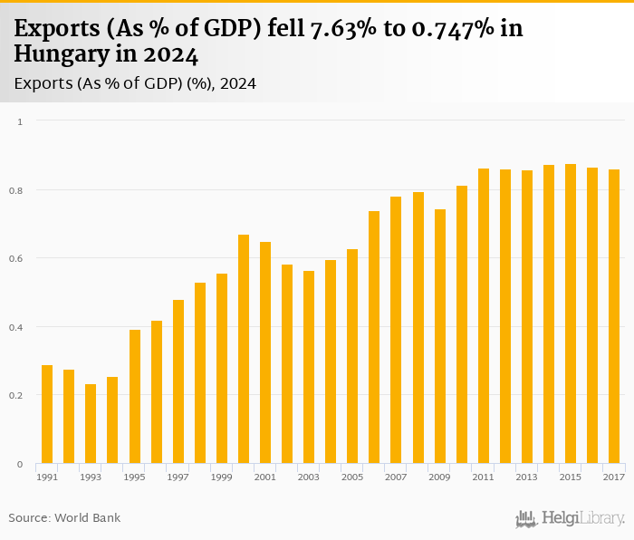 Exports as a share of GDP fell 7.63% to 0.747% in Hungary in 2024, according to the National Statistical Office.