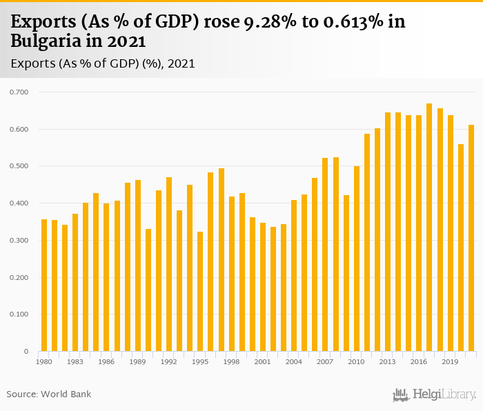 Historically, exports as a share of GDP in Bulgaria reached an all time high of 0.700% in 2022 and an all time low of 0.323% in 1995. When compared to Bulgaria's main peers, exports as a share of GDP in Greece amounted to 0.420%, 0.356% in Romania, 0.527% in Serbia and 0.280% in Turkey in 2024.