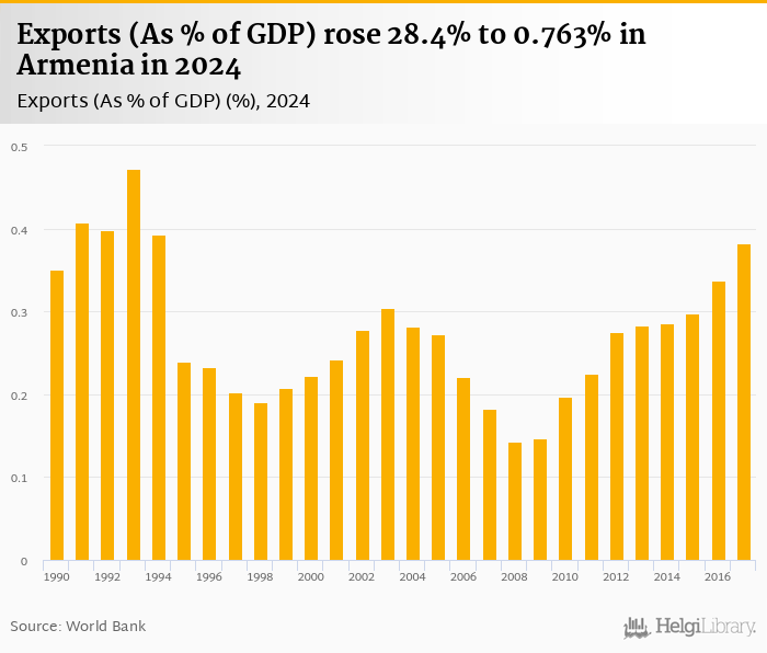 Exports as a share of GDP rose 28.4% to 0.763% in Armenia in 2024, according to the National Statistical Office.
