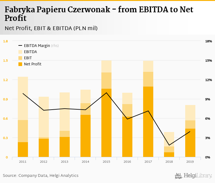 Fabryka Papieru Czerwonak made a net profit of PLN 0.445 mil with revenues of PLN 20.5 mil in 2019, up by 485% and down by 4.49%, respectively, compared to the previous year. This translates into a net margin of 2.17%.