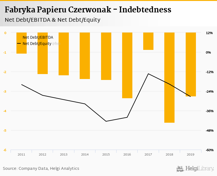 Fabryka Papieru Czerwonak's net debt stood at PLN -2.63 mil and accounted for -27.4% of equity at the end of 2019. The ratio is down 7.70 pp compared to the previous year.