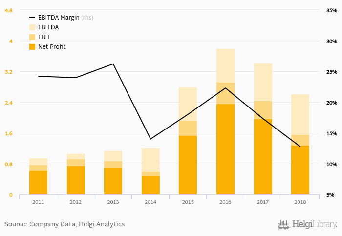 Fabryka Papieru Kaczory made a net profit of PLN 1.28 mil with revenues of PLN 20.5 mil in 2018, down by 35% and up by 3.83%, respectively, compared to the previous year. This translates into a net margin of 6.25%.