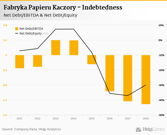 Fabryka Papieru Kaczory's net debt stood at PLN -3.42 mil and accounted for -30.1% of equity at the end of 2018. The ratio is up 7.11 pp compared to the previous year.