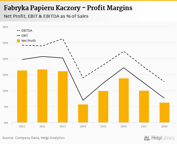 Fabryka Papieru Kaczory made a net profit of PLN 1.28 mil with revenues of PLN 20.5 mil in 2018, down by 35.0% and up by 3.83%, respectively, compared to the previous year.