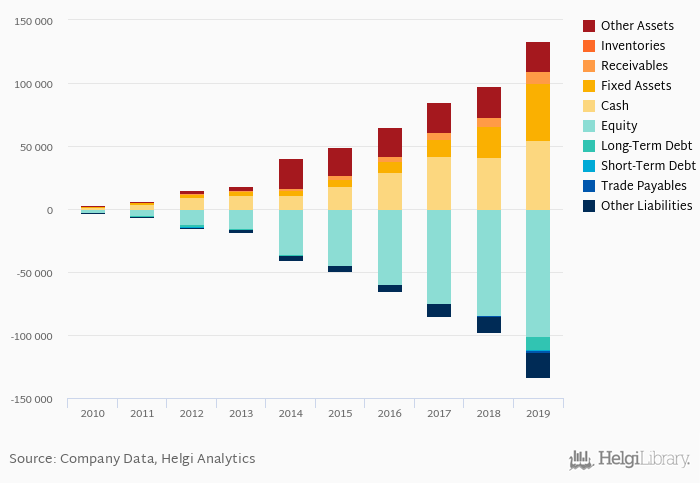 By contrast, total debt reached USD 10,797 mil at the year-end, or 8.10% of total assets, while the firm's equity amounted to USD 101,054 mil. As a result, net debt stood at USD -44,058 mil at the end of 2019 and accounted for -0.436% of equity.