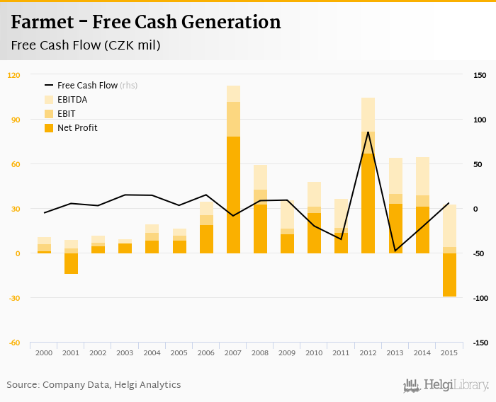 Farmet made a net profit of CZK -29.2 mil with revenues of CZK 533 mil in 2015, down by 193% and down by 19.1%, respectively, compared to the previous year. This translates into a net margin of -5.48%.