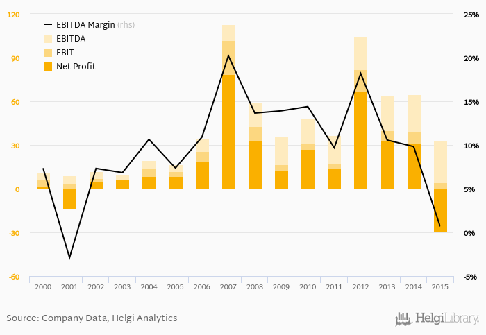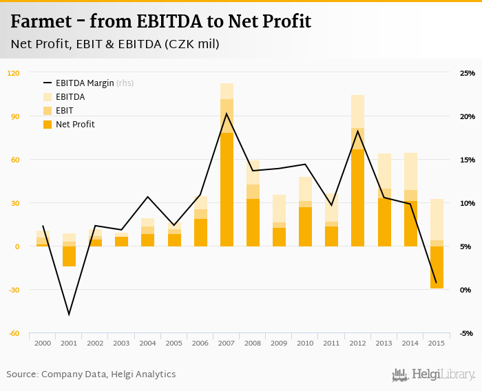 Farmet made a net profit of CZK -29.2 mil with revenues of CZK 533 mil in 2015, down by 193% and down by 19.1%, respectively, compared to the previous year. This translates into a net margin of -5.48%.