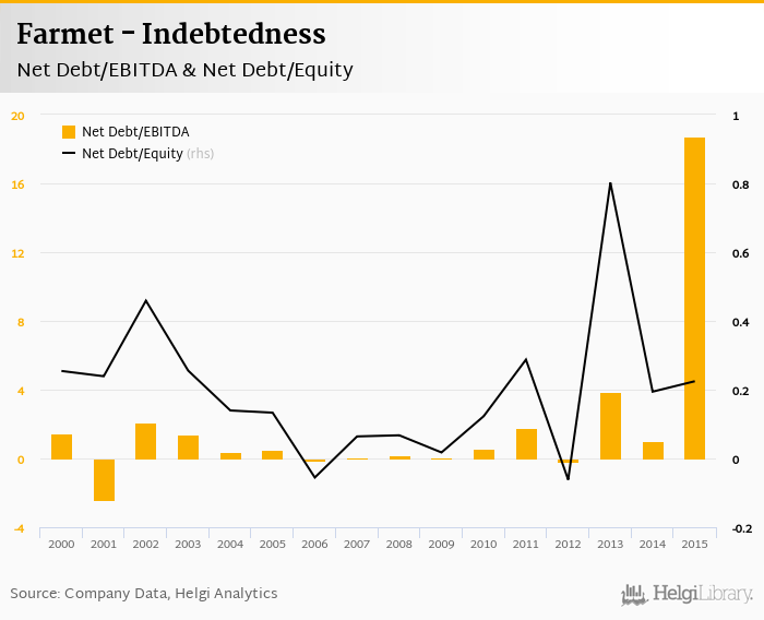 Farmet's net debt stood at CZK 67.7 mil and accounted for 0.225 of equity at the end of 2015. The ratio is up 0.030 pp compared to the previous year.