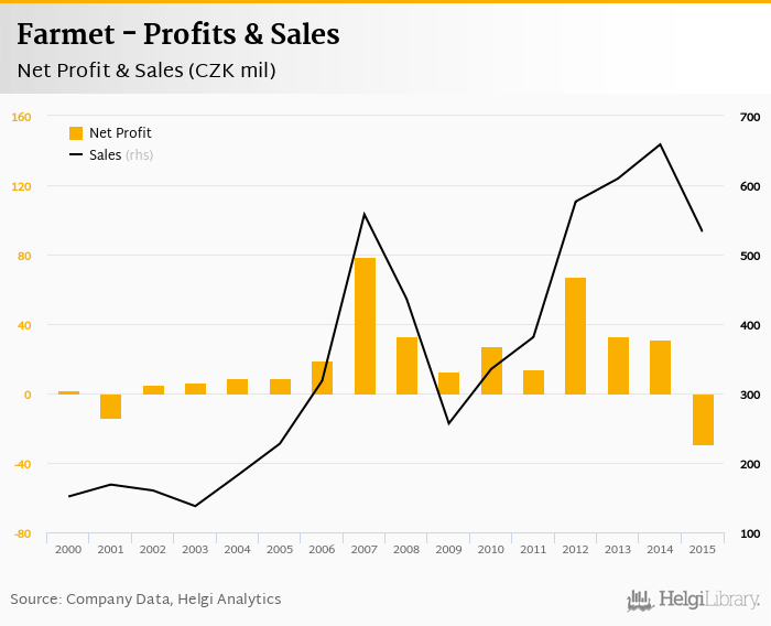 Farmet made a net profit of CZK -29.2 mil in 2015, down 193% compared to the previous year. Total sales reached CZK 533 mil, which is down 19.1% when compared to the previous year.