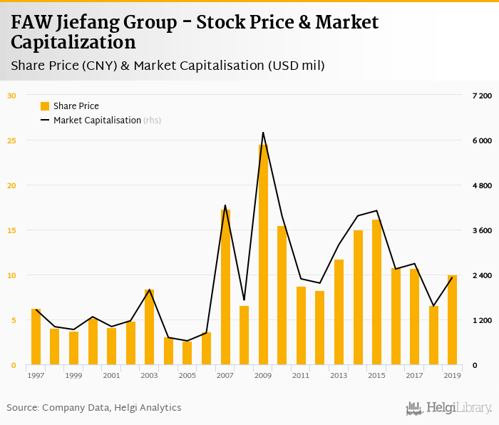 FAW Jiefang Group stock traded at CNY 9.97 per share at the end 2019 implying a market capitalization of USD 2,330 mil.