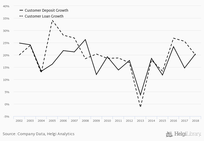 On the other hand, bank's customer deposit growth amounted to 20.5% at the end of 2018, up from 14.7% when compared to the previous year. Historically, the bank’s deposit growth reached an all time high of 26.2% in 2008 and an all time low of 3.68% in 2013. In the last decade, the average annual loan growth amounted to 15.4%.