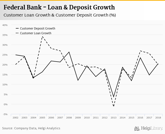 Federal Bank's customer loan growth reached 19.9% in 2018, down from 25.5% compared to the previous year. Historically, the bank’s loans growth reached an all time high of 34.1% in 2005 and an all time low of -1.41% in 2013. In the last decade, the average annual loan growth amounted to 17.4%.