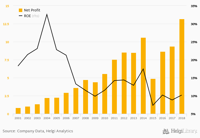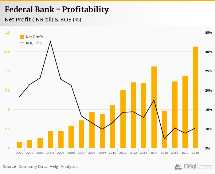Federal Bank made a net profit of INR 13.2 bil in 2018, up 40.7% compared to the previous year. This implies a return on equity of 10.2%.
