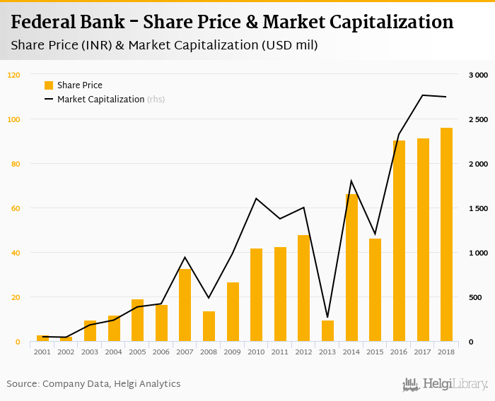 Federal Bank stock traded at INR 96.1 per share at the end of 2018 implying a market capitalization of USD 2,745 mil.
