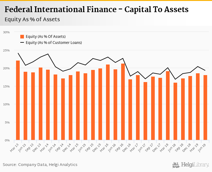 Federal International Finance's Equity reached 18.1% of total assets in the 2Q2019, up from 16.0% for the previous year. As a share of net customer loans, the ratio amounted to 19.3% at the end of the second quarter of 2019.