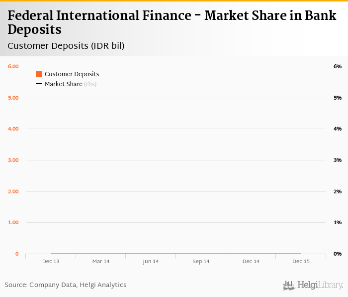 Federal International Finance accounted for 0% of all customer deposits taken by banks in Indonesia at the end of 2015-12-31. Historically, the bank’s market share in customer deposits reached an all time high of 0% in 2015-12-31 and an all time low of 0% in 2013-12-31.
