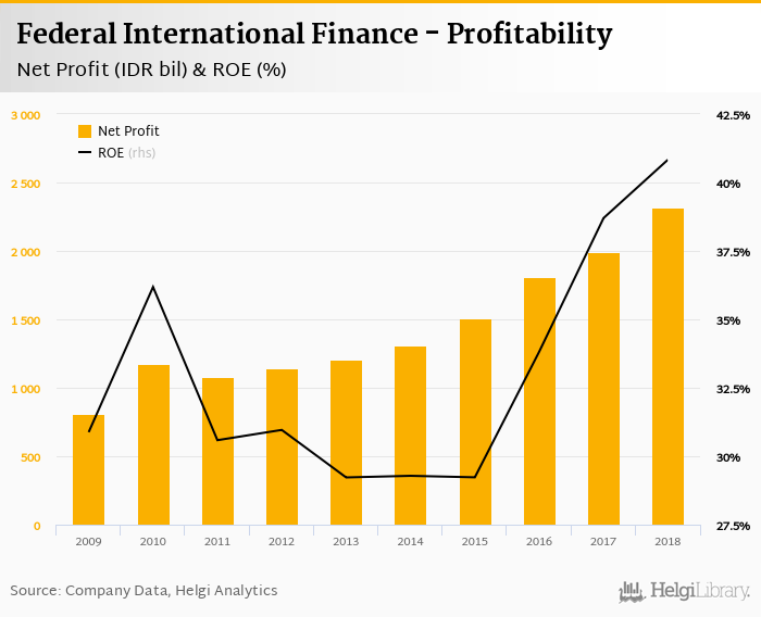 Federal International Finance made a net profit of IDR 2,315 bil in 2018, up 16.3% compared to the previous year. This implies a return on equity of 40.8%.