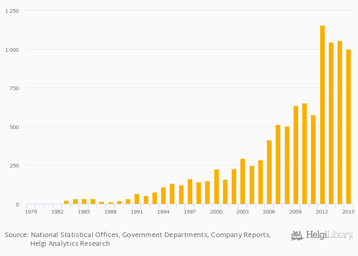 Historically, feldspar production in Iran reached an all time high of 1,155 kt in 2012 and an all time low of 2.00 kt in 1981.