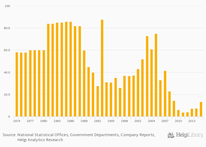 Historically, feldspar production in Romania reached an all time high of 87.7 kt in 1993 and an all time low of 3.81 kt in 2011.