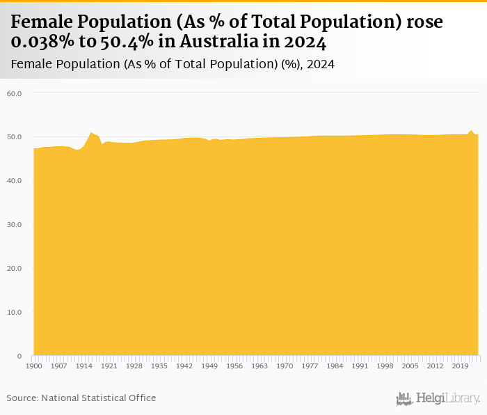 Female population as a percentage of total population rose 0.038% to 50.4% in Australia in 2024, according to the National Statistical Office.