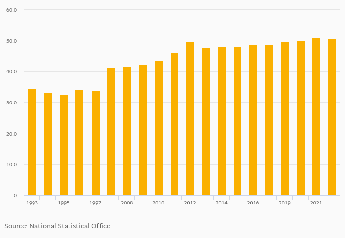 | Romania | % | 50.8% | 51.3% | 50.9% | 51.7% | 52.2% | ... | |||||||||||||||
