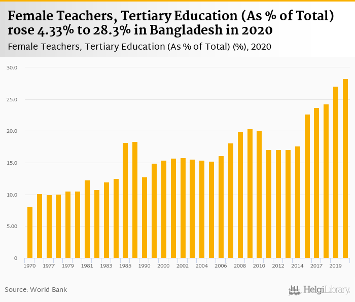 Female teachers, tertiary education as a percentage of total rose 4.33% to 28.3% in Bangladesh in 2020, according to World Bank.