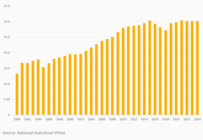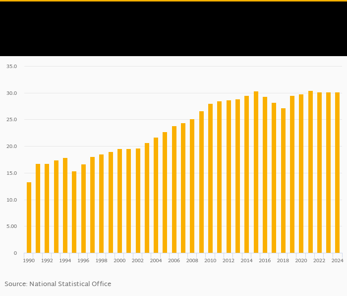 | Pakistan | % | 27.2% | 29.5% | 29.8% | 30.4% | 30.1% | ||||||||||||||||