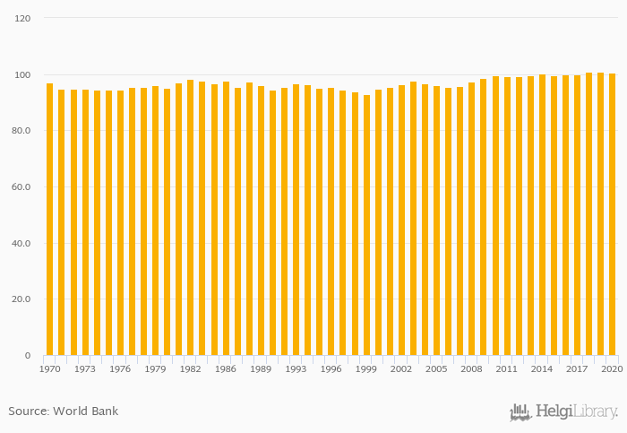 Historically, female to male primary enrollment rate in Brunei reached an all time high of 101% in 2019 and an all time low of 93.0% in 1999.