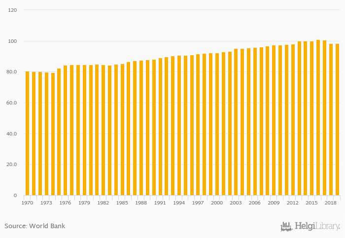 Female to male primary enrollment rate rose 0.094% to 98.3% in the World in 2019, according to World Bank.