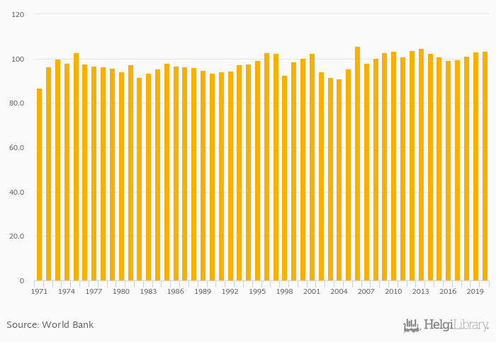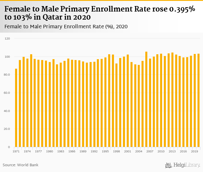 Female to male primary enrollment rate rose 0.395% to 103% in Qatar in 2020, according to World Bank.