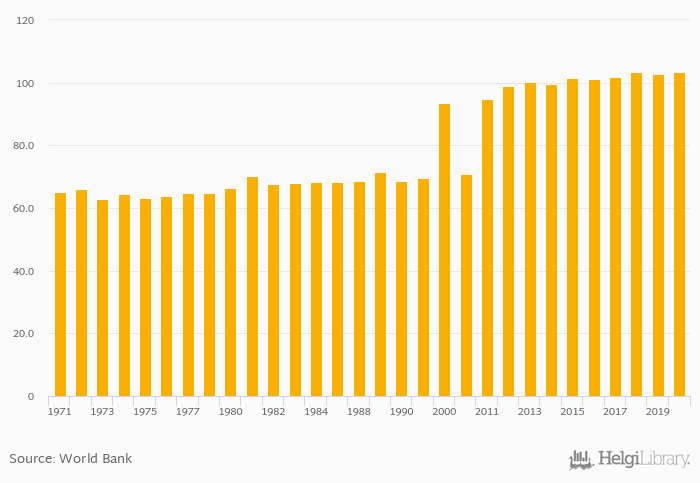 Female to male primary enrollment rate rose 0.719% to 103% in Sierra Leone in 2020, according to World Bank.