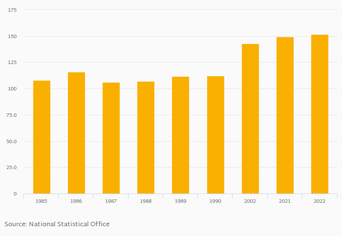 Historically, female to male tertiary enrollment rate in Suriname reached an all time high of 152% in 2022 and an all time low of 106% in 1987.