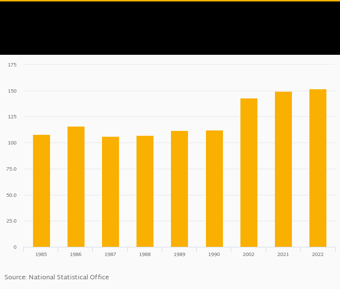 Female to male tertiary enrollment rate rose 1.79% to 152% in Suriname in 2022, according to World Bank.