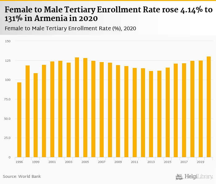 Female to male tertiary enrollment rate rose 4.14% to 131% in Armenia in 2020, according to World Bank.